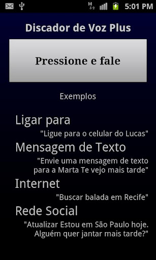 Com este aplicativo, você consegue fazer ligações, enviar mensagens de texto, atualizar o Facebook e o Twitter, além de fazer buscas na internet com o seu telefone usando o poder da sua voz! Este aplicativo suporta os seguintes idiomas: